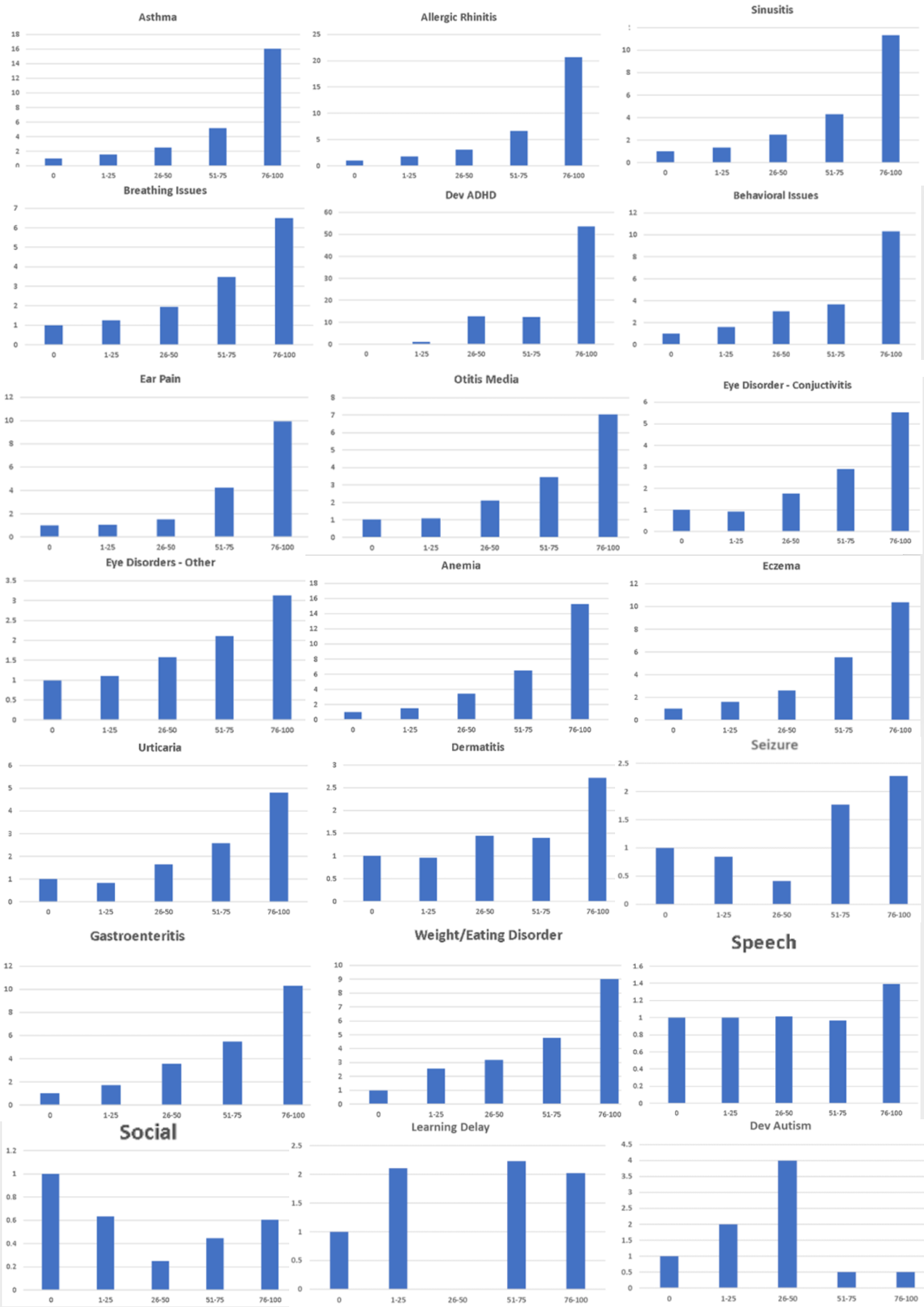 Likewise, when Thomas compared how likely a child was to come in for an office visit for a variety of health concerns, he found the greater the number of total vaccines a child received (which varied widely in his practice), the more likely they were to require an office visit for a variety of conditions.