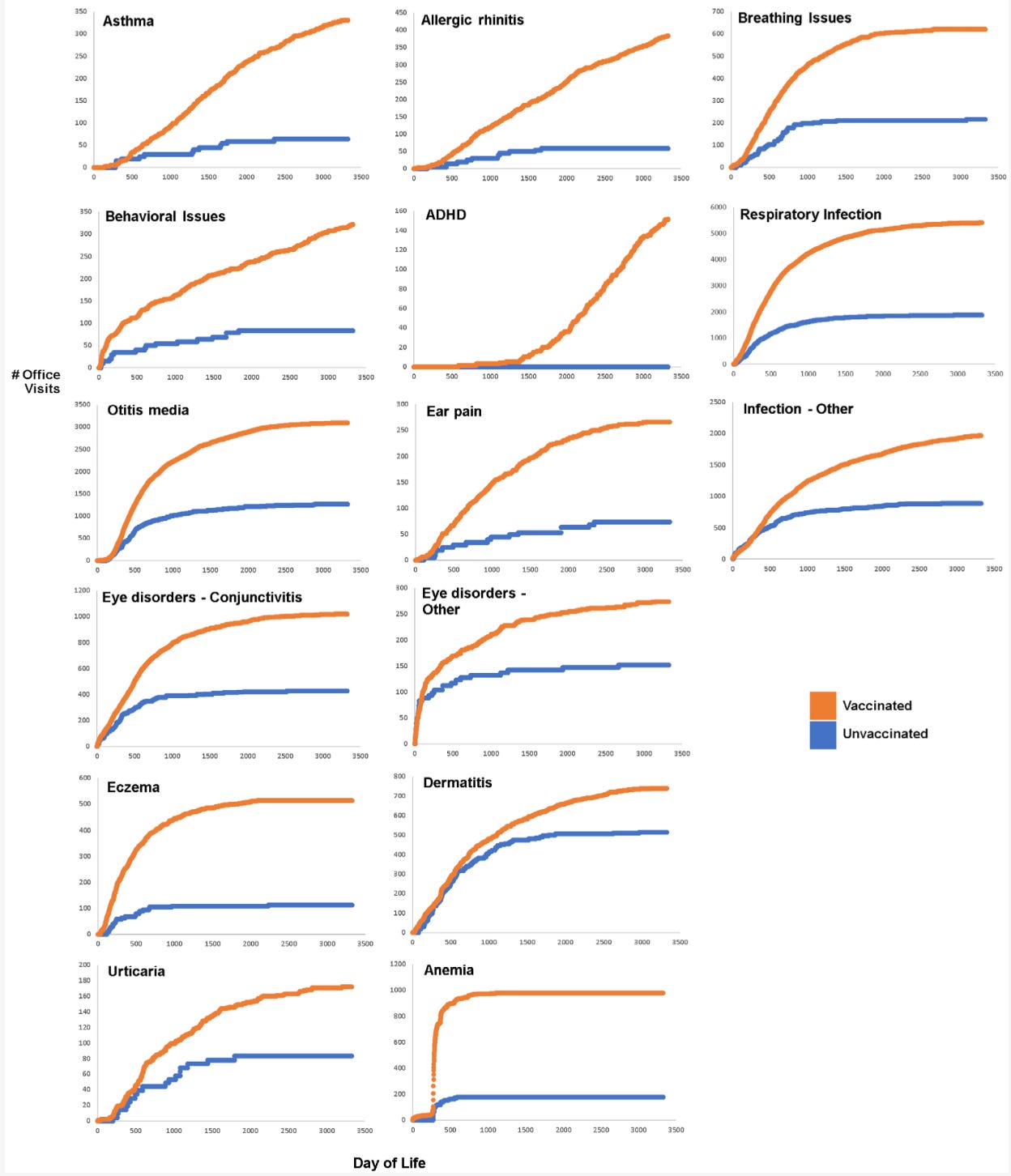 In his study, to compare the health of 2763 vaccinated children and the 561 unvaccinated children born into his practice, he plotted how many total visits each group had for a variety of issues as their age increased (e.g., how many visits for asthma in total had occurred in vaccinated children who were 1000 days old or younger) and then compared the two (with the unvaccinated group’s visits being equalized by multiplying them by 4.9 [2763/561]). This data in turn suggested vaccinations were the primary agent responsible for the epidemic of chronic diseases in our society.