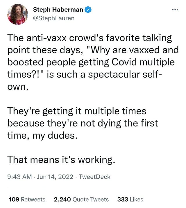One of the sad realities of our current political discourse is that typically when people are wrong, rather than admit it they will double down on their position and sometimes even triple down (double masking and the triple maskers being an excellent example). Taking a booster, the sheer act of which forces you to acknowledge you were lied to regarding the initial promises of the vaccine (95% effective!) is another such example. This for example was tweeted today by the Lead programming editor for MSNBC New York:
