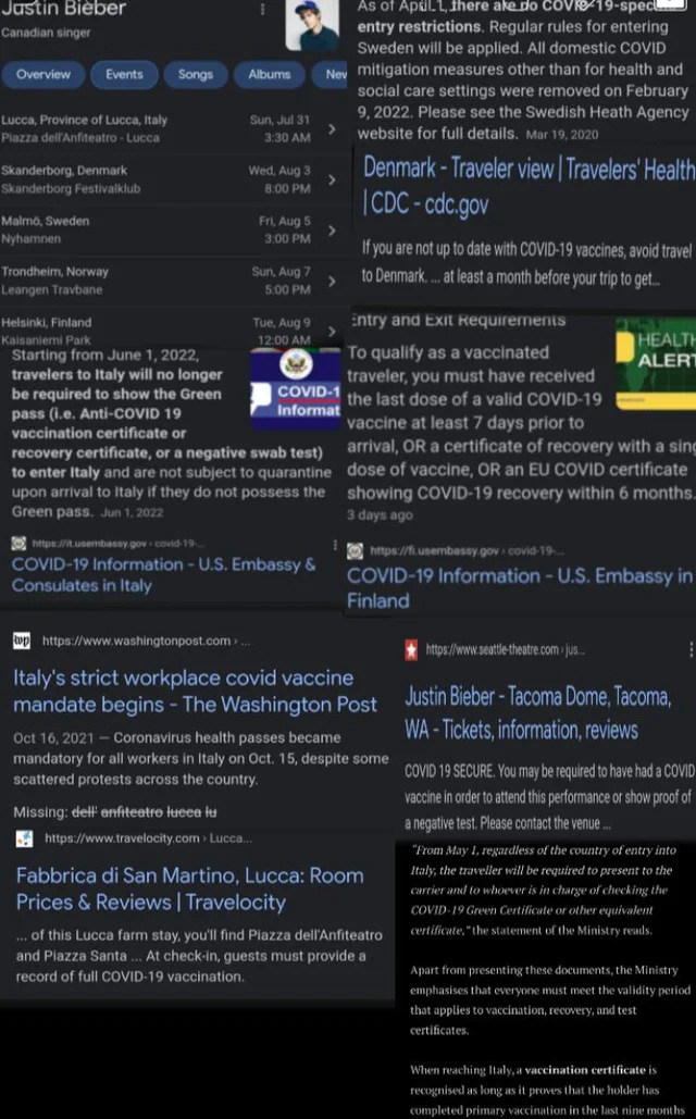 Justin Bieber required attendees at his concerts to be vaccinated. Additionally, Bieber performed in countries that required vaccination to enter. Given that even Novak Djokovic was not permitted to enter countries with vaccine passports (and a lot of money was riding upon him participating in tennis tournaments) it seems unlikely that Bieber was able to get around this requirement.
