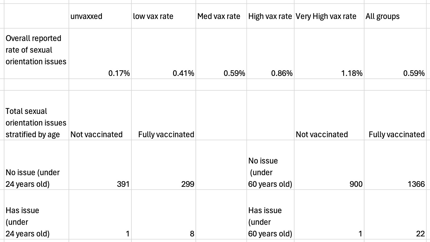 From it, he found that when the data pool was restricted to those under 60, the vaccinated were 13.6X more likely to develop sexual orientation issues (which became 14.5X once more data came in), while when it was restricted to those under 24, vaccination made them 10.4X more likely to develop sexual orientation issues. This was such a high odds ratio that it proved to Kirsch vaccination had to be the primary cause of over 90% of transgenderism (for context smoking has a 15-30X odds ratio of causing lung cancer).