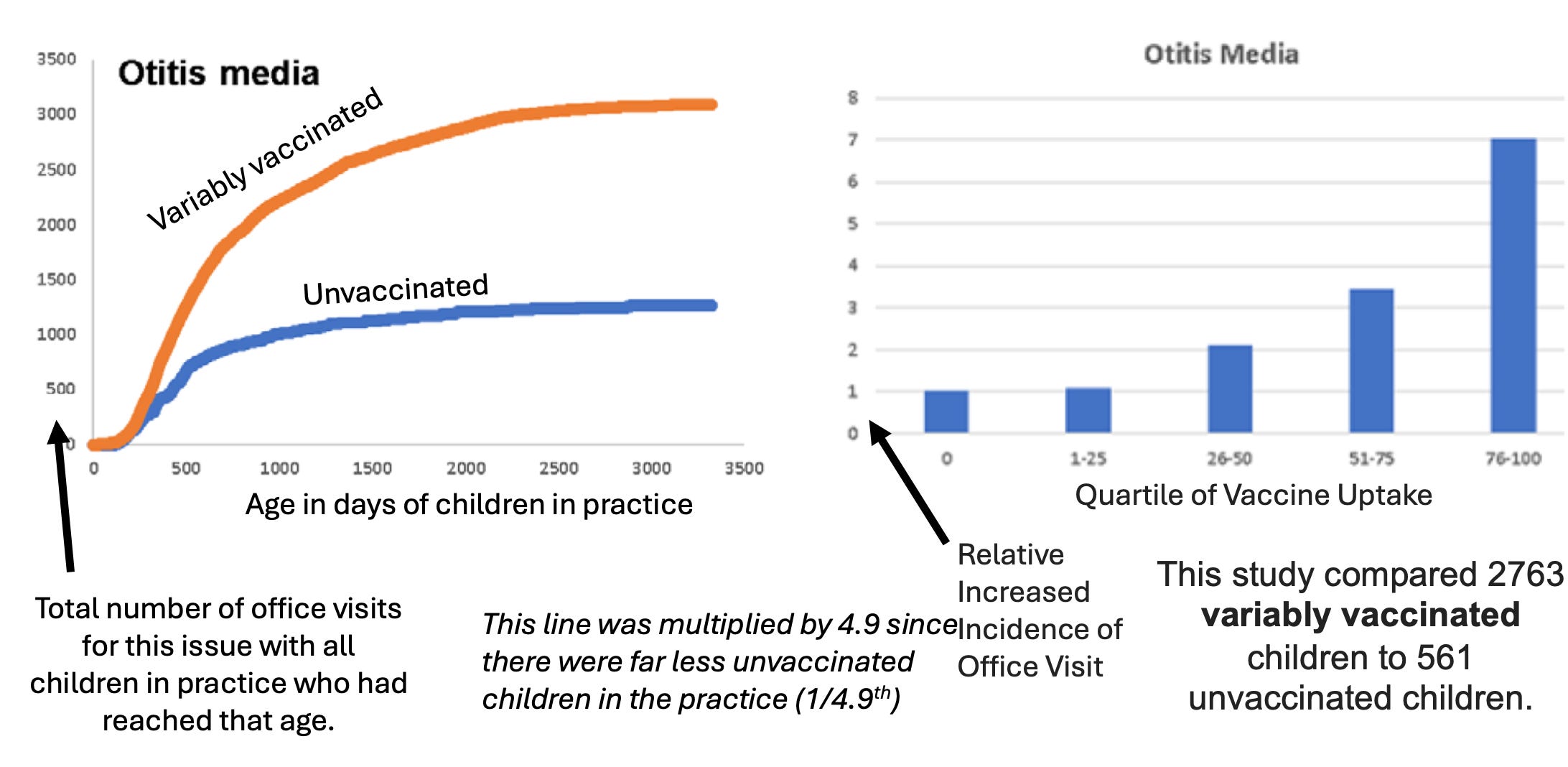 Similar data was also found from the records of pediatric practices. In one study of 2047 children, vaccination caused a 2.49X increase in middle ear infections. Finally, a pediatrician with a large practice who analyzed his charts found a comparable (3X to 7X) increase: