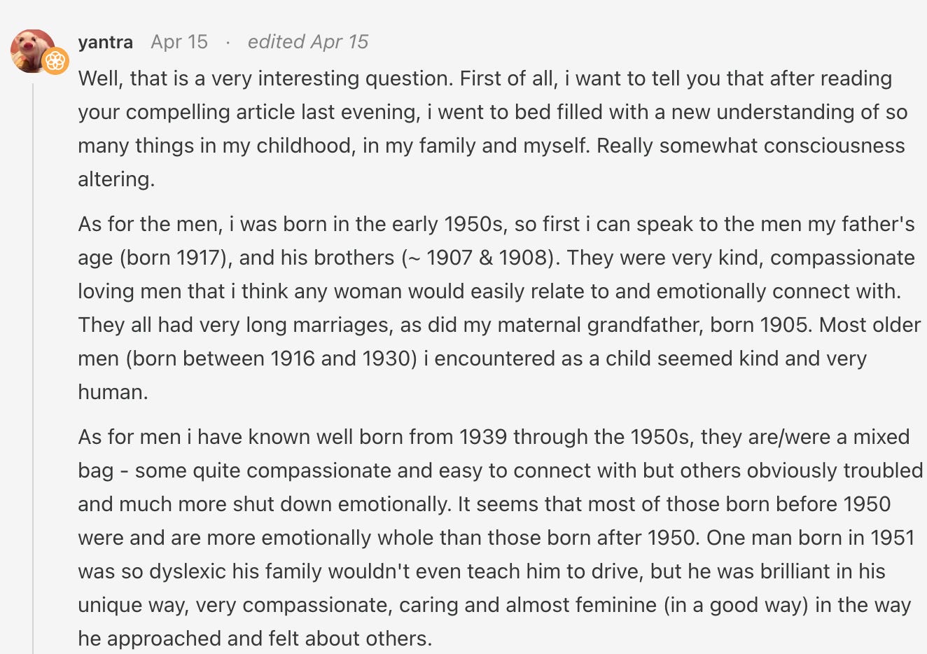 As I’m too young to have been able to observe this, but I’m blessed to have numerous witty and sharp female subscribers who have been around long enough to notice this, I asked a few of them if they’d noticed the men who were born after World War 2 (as this is when mass DPT vaccinations began) were different from the men before. To quote one reader: