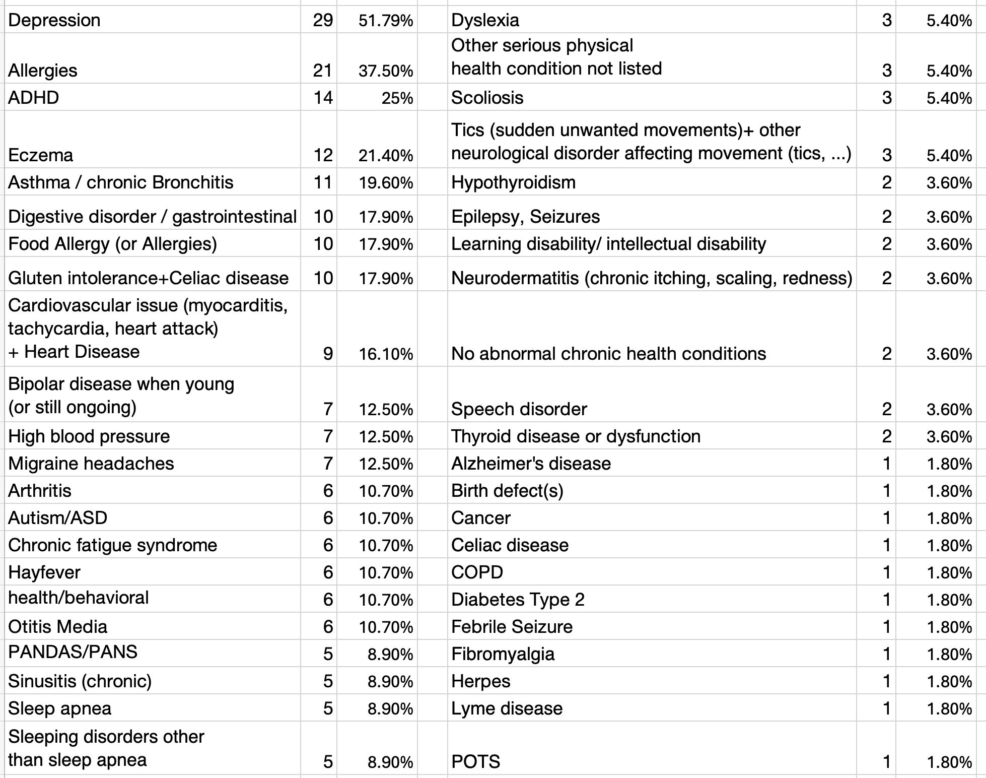 Most of the respondents suffered from a variety of other chronic illnesses (almost all of which are ones classically leaked vaccine injuries—hence why Steve included them in his survey). Once I excluded the conditions that weren’t appropriate to include (e.g., Down’s Syndrome or a COVID vaccine injury), the total number ranged from 0-12 for the respondents and averaged 4.5 in total. Those illnesses (listed by what number and percent of respondents had them) were as follows: