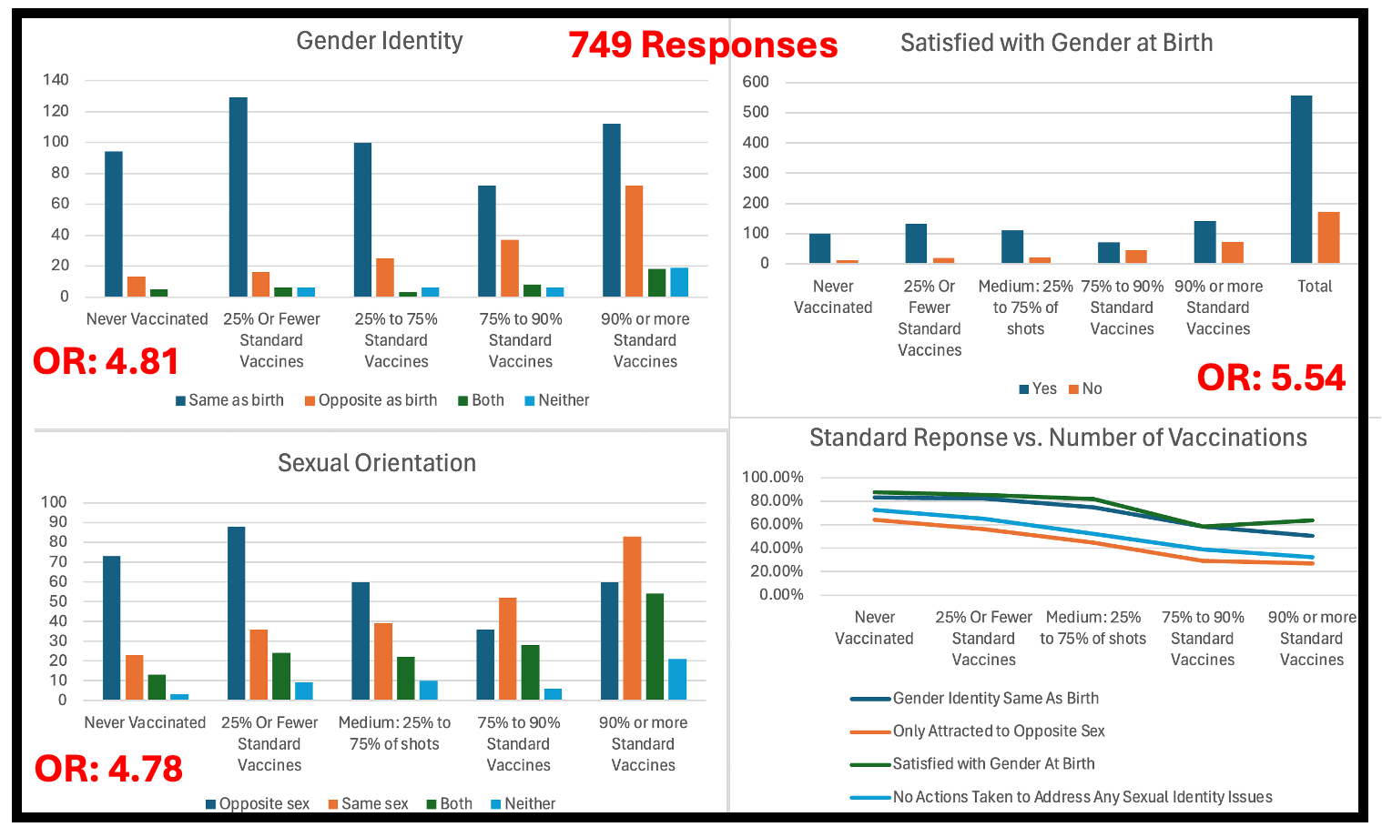 In Kirsch’s survey of 13,000 people, participants were given the option to select 78 different conditions (e.g., “scoliosis”), some of which Kirsch found had no association with vaccination (e.g., a 1.02X increase for COPD) and some of which Kirsch found had a strong association with vaccination (e.g., the stronger were a 10.8X increase for febrile seizures and a 7.09X increase for epilepsy—both conditions which have long been associated with vaccination). This entire series came about because Kirsch noticed a surprising result in his survey—the third largest increase was vaccinated individuals 6.9X being more likely to experience sexual orientation issues than unvaccinated individuals. This prompted him to take a closer look at that data: