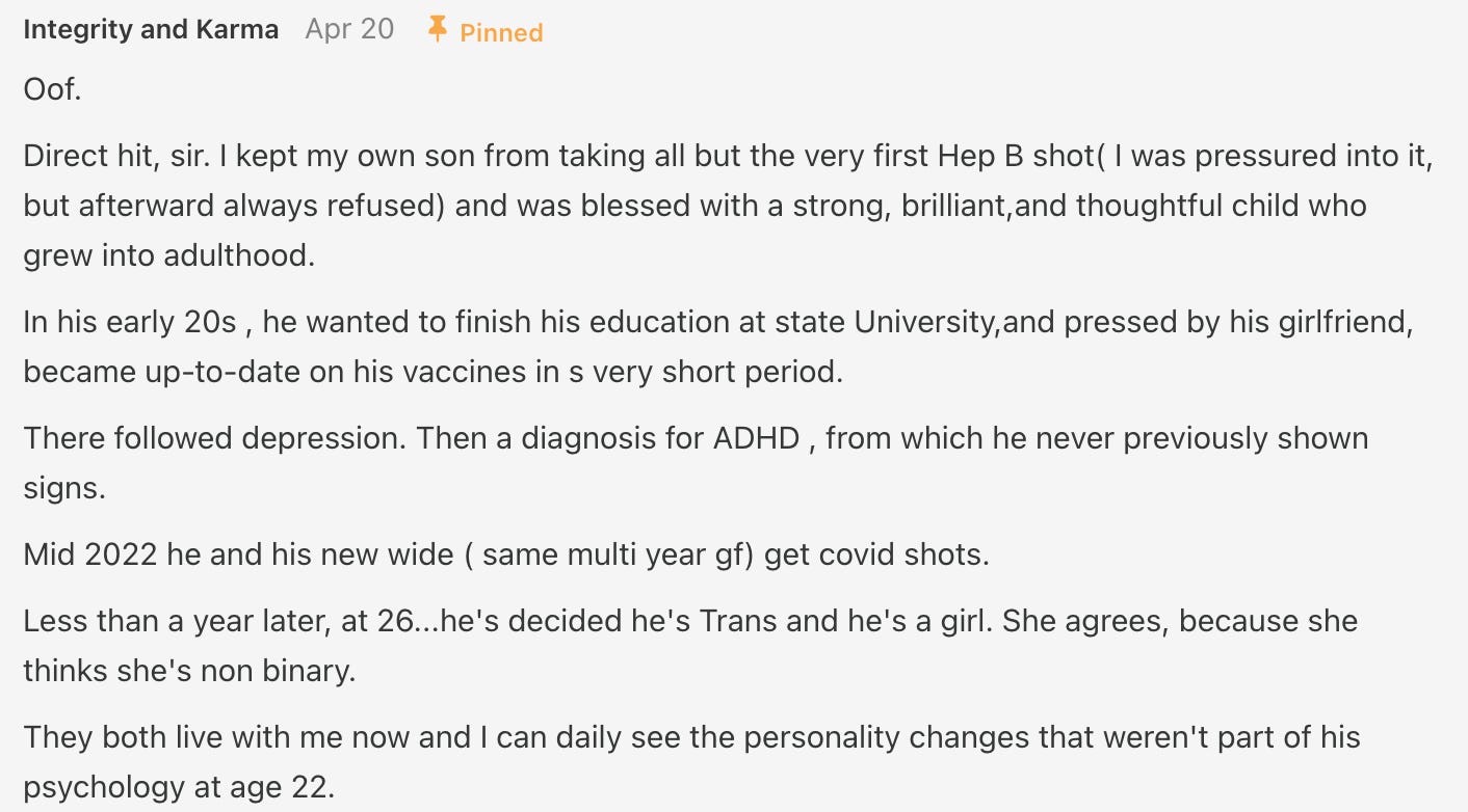 In short, I felt that while it was unlikely vaccines were the primary cause in all cases, it was possible vaccines created neurological damage which made individuals more susceptible to other factors (e.g., social pressure) which caused gender confusion.
