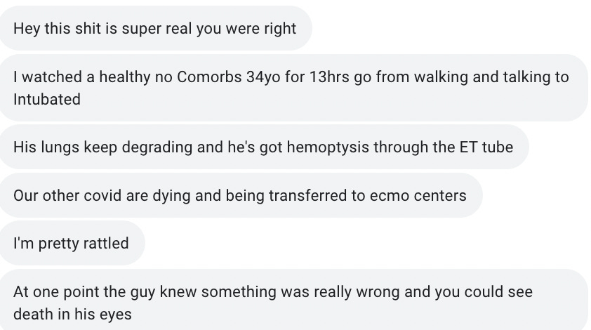 •Come March, I started getting texts like this one from a friend working in NYC (this is an ER Doc I had review this article who was in the worst hit part of the city and whom I had tried to convince to buy personal protective equipment when it was still available for purchase):
