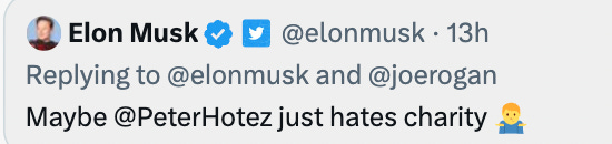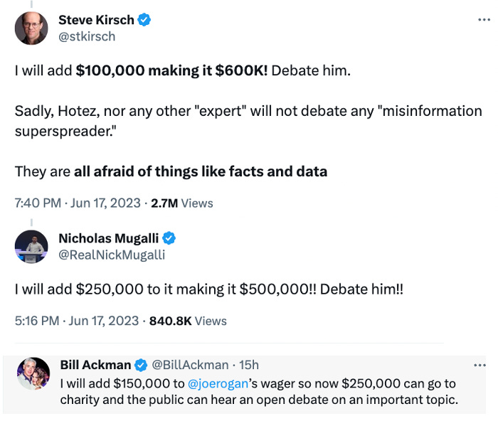 If you take a step back, Hotez’s refusals to debate make it very clear he’s a grifter; he claims to be a selfless advocate for the poor, yet he cares so much about protecting his grift by not losing face he’s not even willing to spend a few hours chatting with someone he disagrees with to donate more money to the poor than most of us will make in our lifetimes. Fortunately, everyone could see this: