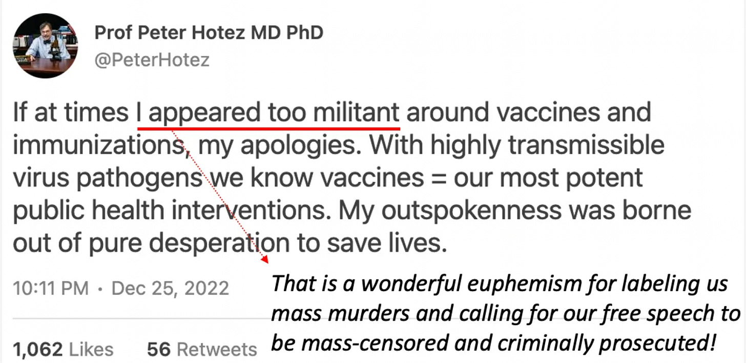 After Hotez got the mass censorship he clamored for, he then pivoted to aggressively defending the current narrative on television, frequently asserting statements with absolute certainty that were later definitively proven to be false. Following this, he then pivoted to gradually denouncing with increasing fervor anyone who questioned the narrative (i.e., Hotez's lies), which gradually escalated to him calling for any criticism of Anthony Fauci to become a federal hate crime and for governments around the world to mobilize against anyone who did not support COVID-19 vaccines because vaccine skeptics were killing people