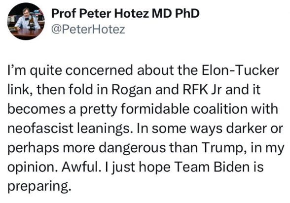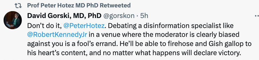 I share all of this to illustrate that the public is no longer buying the approach Hotez et. al have used for decades (e.g., RFK Jr. is already polling at 20% in the election). They can throw as many allegations as they want from afar, but unless they debate their ideas, they are going to rapidly fade into irrelevance and mockery.