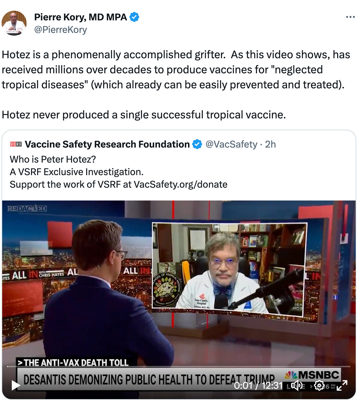 Two days ago, I discussed these events and this article with another colleague who informed me that Hotez was about as classic a grifter as they come (e.g., consider all the money he’s taken to develop failed vaccines), and that I would be guaranteed to see Hotez go quite far to protect his grift.