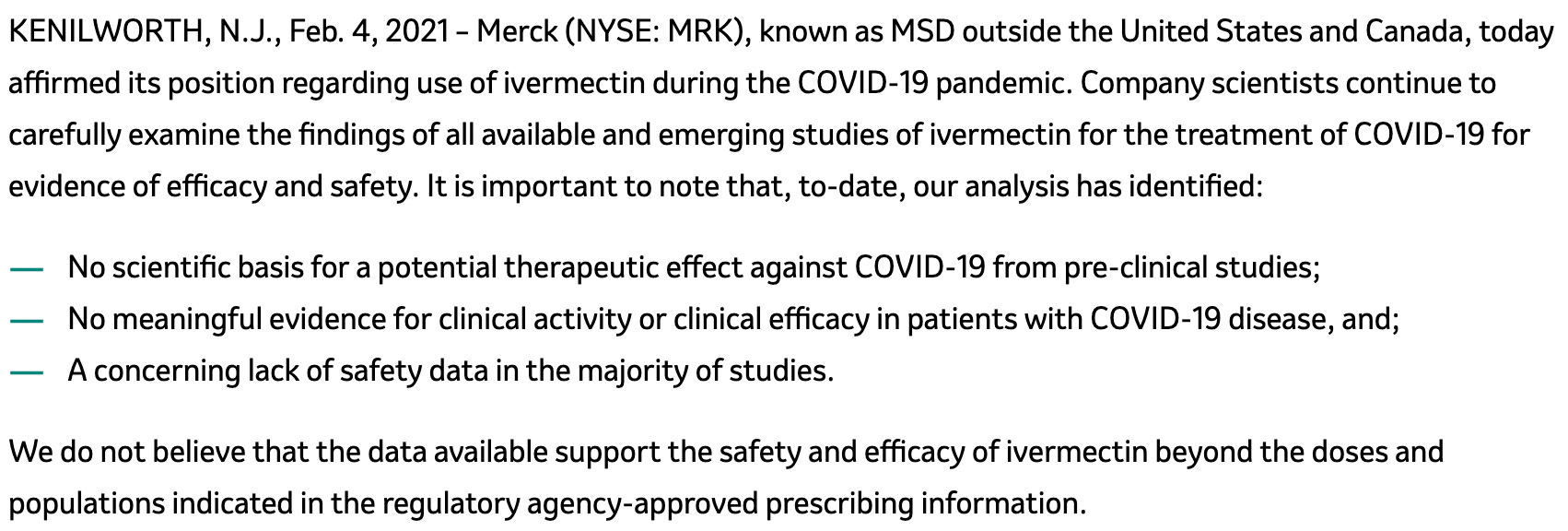 In addition to a large degree of existing evidence that ivermectin was helpful for COVID-19, this statement is particularly ironic, because Merck developed the robust safety data that was originally used to license ivermectin, and Merck has received massive fines for promoting dangerous uses of their drugs which differ from the regulatory agency approved prescribing information.