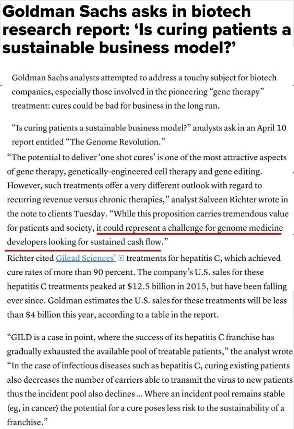 At the time this report was published, it understandably provoked significant outrage as these economic principles were not that well understood by those outside of the industry. Most pharmaceutical products do not cure illnesses, rather they perpetually shoot for a vague target (e.g., lowering cholesterol to prevent heart disease) or temporarily alleviate the symptoms of a chronic condition (e.g., reducing stomach acid production to relieve chronic heartburn).