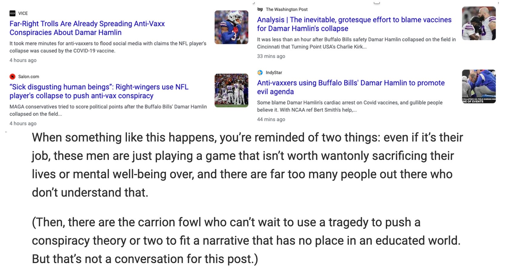 In my eyes, the most important facet about this event was a sports doctor immediately stating the collapse had nothing to do with the vaccine. The theory that doctor put forward was possible but not by any means the most probable explanation since as far as we know there has only been one documented case of this happening during football and that single case did not occur in the NFL (where numerous factors drastically reduce its negligible probability of occurring).