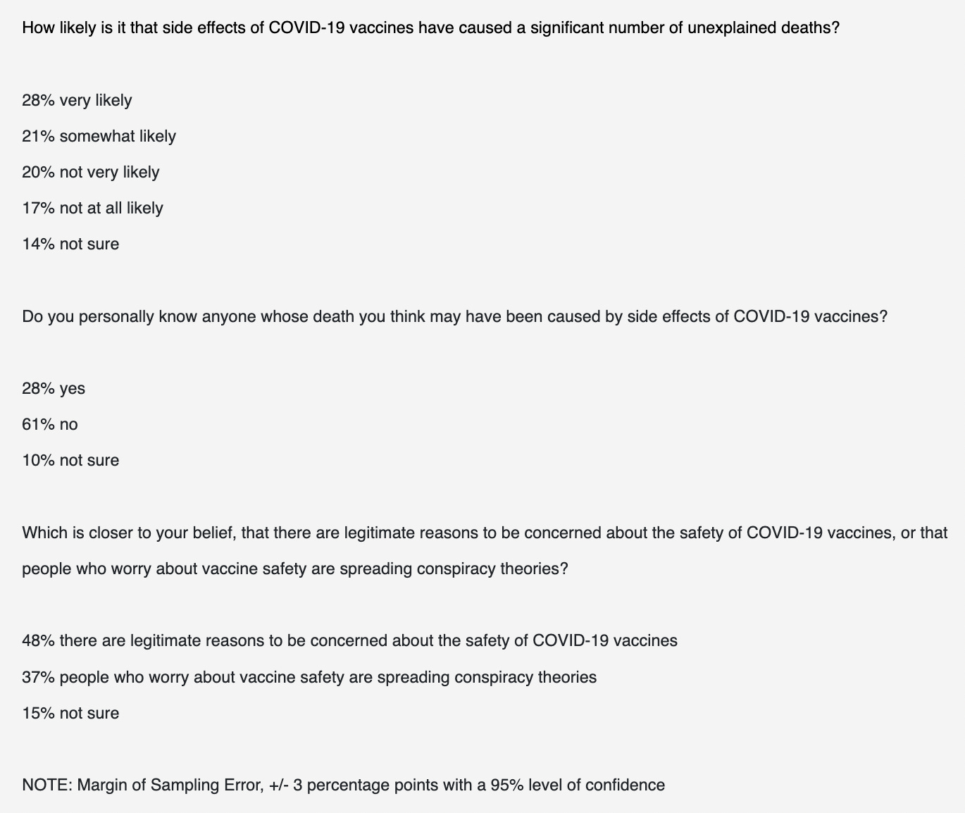 In addition to these results supporting the validity of the poll, consider for a moment the situation of those who were vaccinated and now have serious safety concerns about the vaccine. For example, how would you feel if you were vaccinated and someone you knew died suddenly after vaccination? As this poll shows, that is the position many Americans are in now, and that has profound implications for public trust in our government.