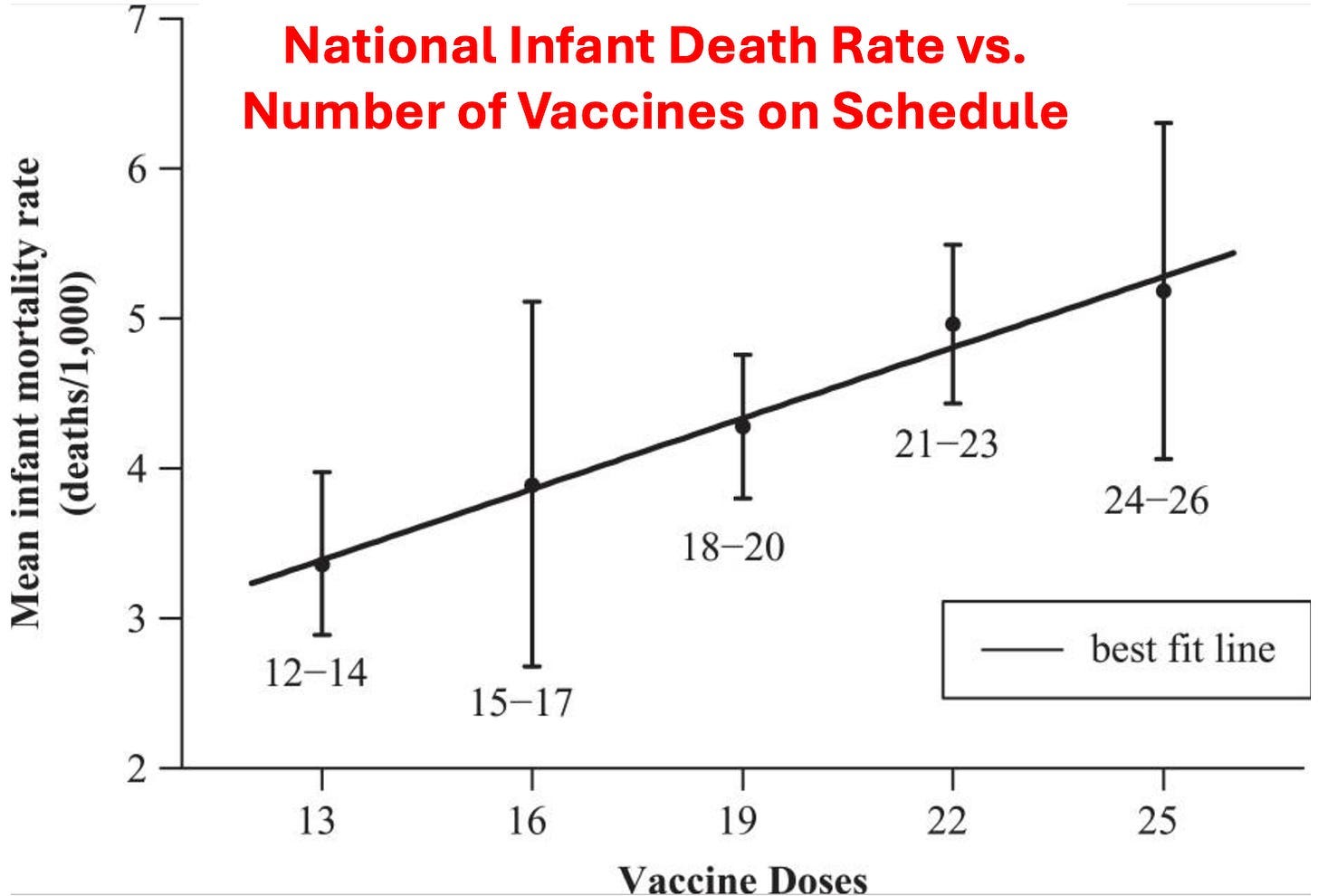 On a national level, this has been shown by SIDS rates going up as the number of vaccines increased. Likewise, a 2011 study of the 34 nations with the lowest infant mortality rate (America being #34) showed an unmistakable relationship between total vaccinations and SIDS.