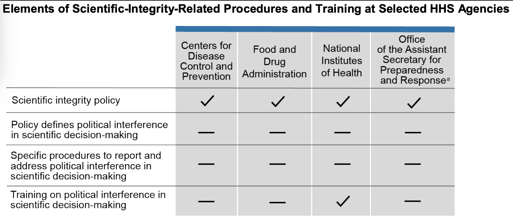 From reading between the lines in the 4/20/22 report, it appears that the GAO found the behavior towards scientific integrity at the CDC, FDA, NIH and ASPR to be appalling. At the same time, the GAO was massively underfunded in conducting this investigation (only 16 interviews were conducted!) and was making a large effort to not rock the boat (as COVID has created a climate where no one is allowed to question insane policies). The GAO hence was very careful about how directly it stated its conclusions.