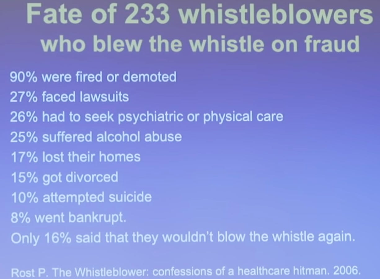 After blowing the whistle on fraud, 90% of the whistleblowers were fired or demoted, 27% faced lawsuits, 26% had to seek psychiatric or physical care, 25% suffered alcohol abuse, 17% lost their homes, 15% got divorced, and 8% were bankrupted. But in spite of this, only 16% said they wouldn’t blow the whistle again.