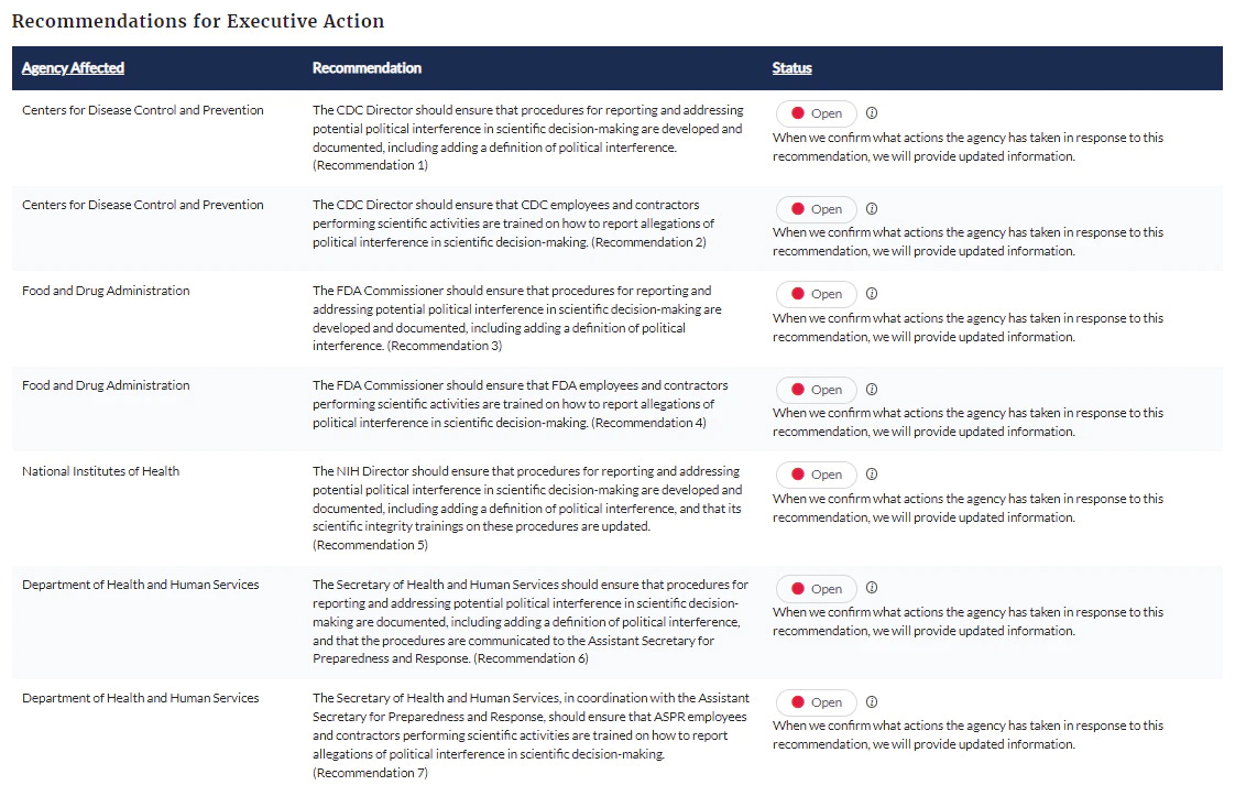 To quote the GAO: “The absence of specific procedures may explain why the four selected agencies did not identify any formally reported internal allegations of potential political interference in scientific decision-making from 2010 through 2021.”