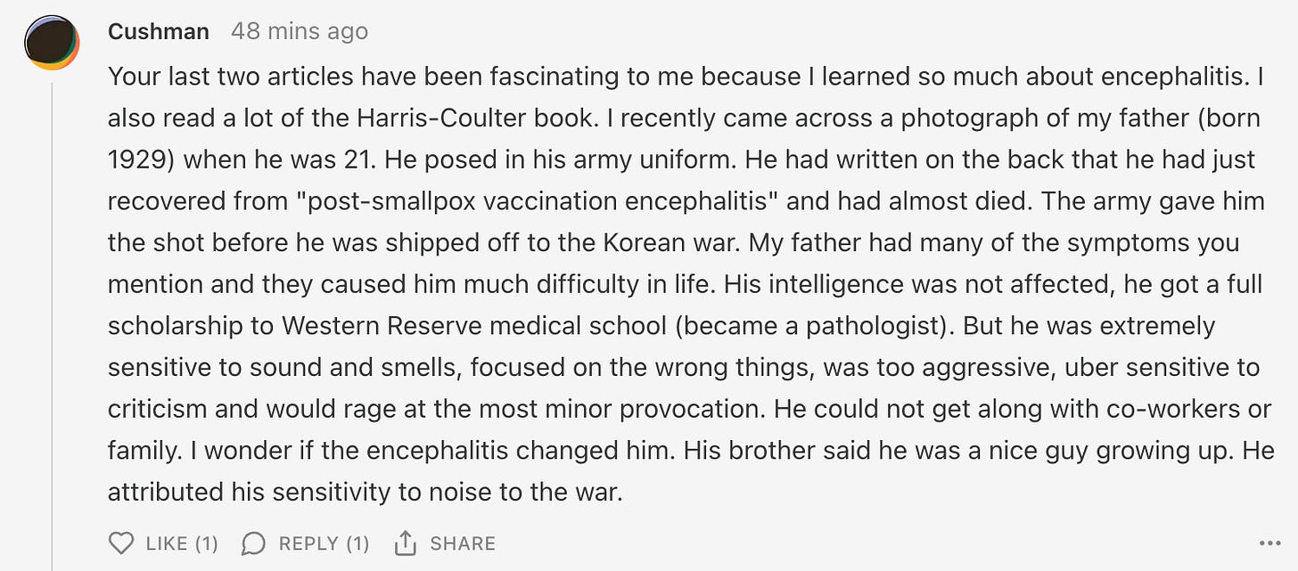 Of the forms of vaccine encephalitis, post-vaccinal (smallpox) encephalitis was the most studied. Originally, this was viewed as related to encephalitis lethargica, a brain disease which swept across the world between 1915-1926 (affecting roughly 1 million people and killing 500,000)—of which the cause still remains one of the greatest medical mysteries of the 20th century. Notably, the personality changes and behavioral disorders seen in its survivors were very similar to those observed follow DPT brain injuries (e.g., a brilliant book I discussed here made a strong case widespread DPT encephalitis completely changed America society and created many new diseases like ADHD—which previously was widely diagnosed as “minimal brain damage”).