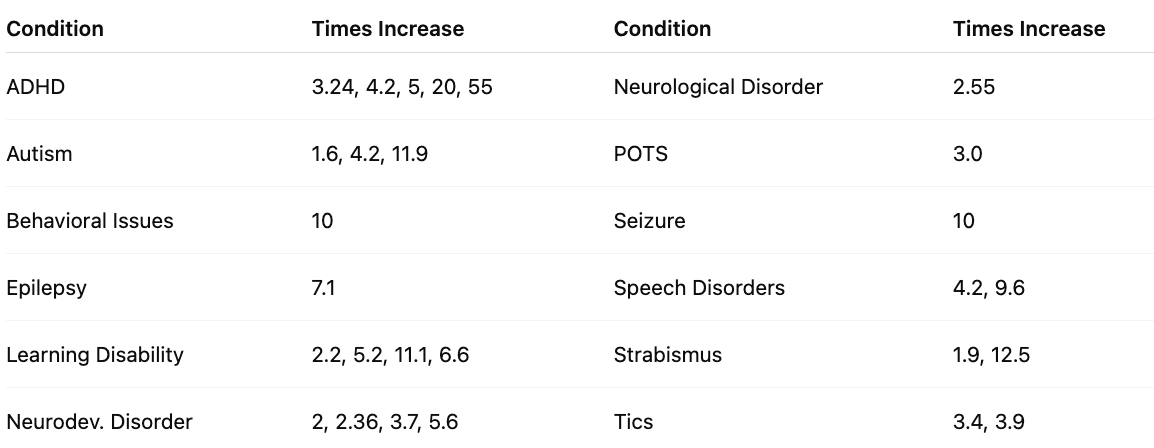 As such, in each case where researchers nonetheless conducted the science (e.g., by reviewing large numbers of patient charts) their data was blocked from publication, and in many cases the researchers were retaliated against (e.g., an Oregon pediatrician lost his medical license). As you might guess, those data sets (which I summarized here) all show a massive increase in common infectious, autoimmune, and neurological diseases of childhood. These for example, were the increases in neurological diseases found across those studies (where for context a 1.1-1.2 [10-20%] increase would normally be enough to get a product a red flag, particularly one given to large numbers of people).