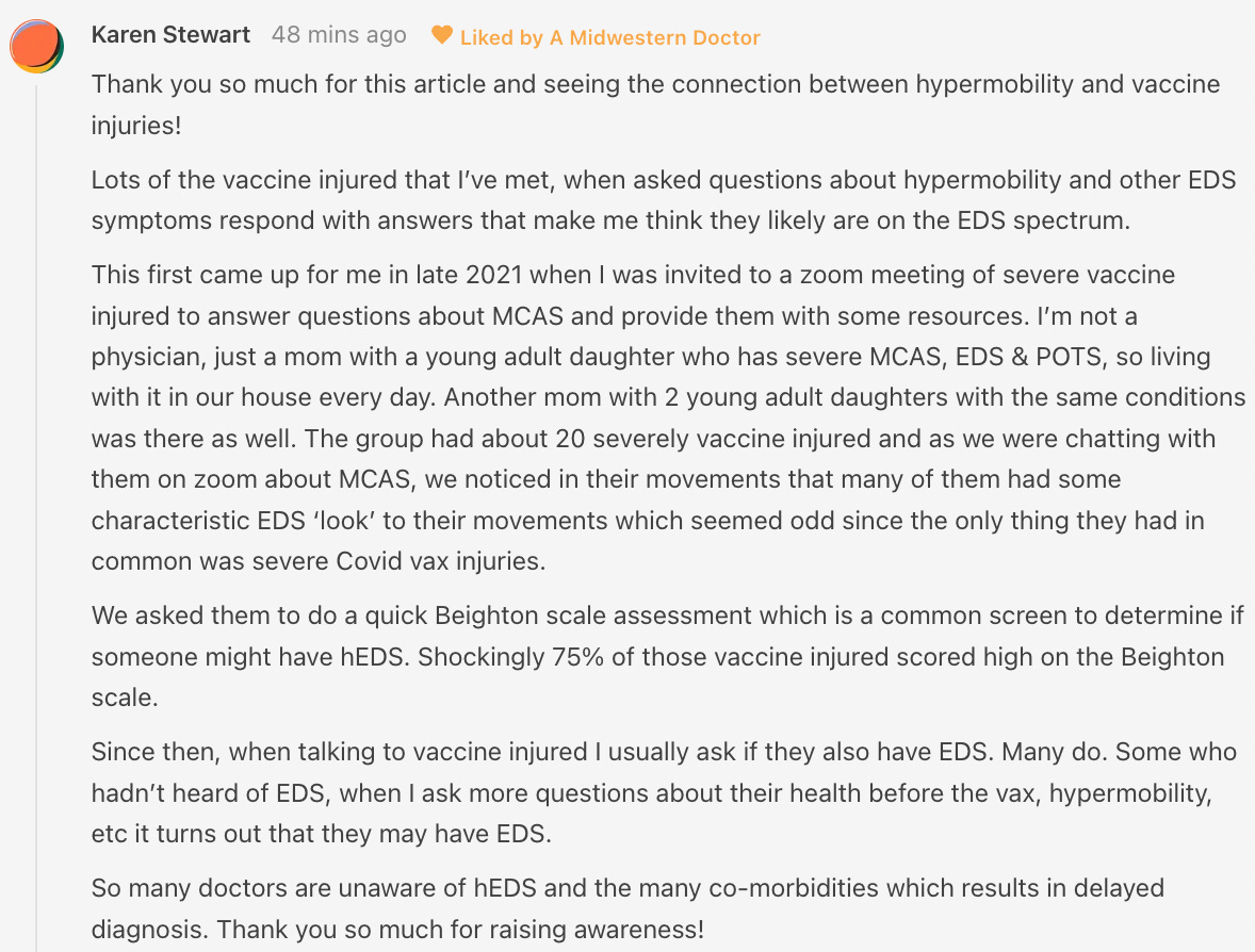 Gardasil caused a variety of debilitating conditions (e.g., constant fatigue, cognitive impairment, a variety of autoimmune conditions and widespread neurologic dysregulation—things also frequently seen after the COVID-19 vaccination). At some point, holistic physicians began noticing patients (particularly women) with existing ligamentous laxity were much more likely to develop Gardasil injuries (and in turn a few researchers proposed genetic variations to account for this).