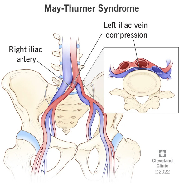 •A condition known as May-Thurner syndrome affects slightly over 20% of the population. In it, the (high pressure) right common iliac artery overlies and compresses the (low pressure) left common iliac vein against the lumbar spine
