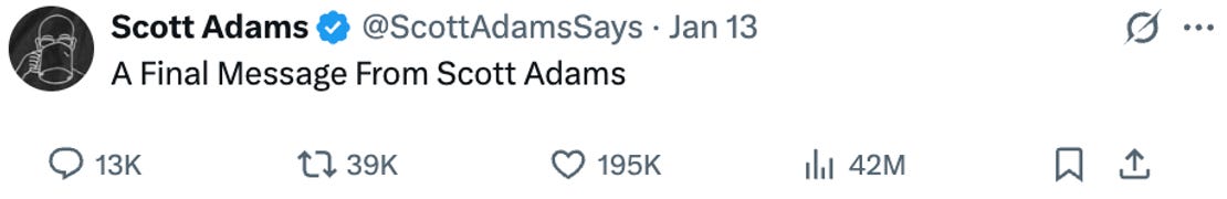 Me: Hi Scott, I asked ███ to pass this along to you. When I saw Trump’s 2015 response at the first debate to the Rosie O’Donnell question, I felt there was a real likelihood he’d win, and soon after found your blog. Since then I’ve learned a ton from it and the perspectives I got from you were one of the things that made my newsletter possible. I wanted to thank you for that the numerous times you’ve shared my work on X and I wish you the best of luck with everything.