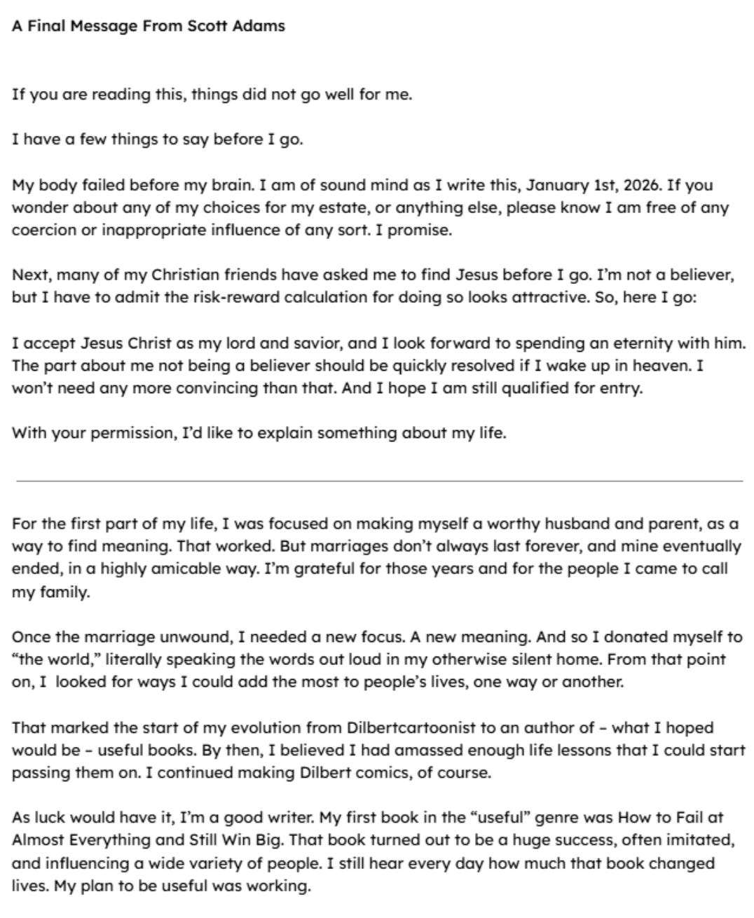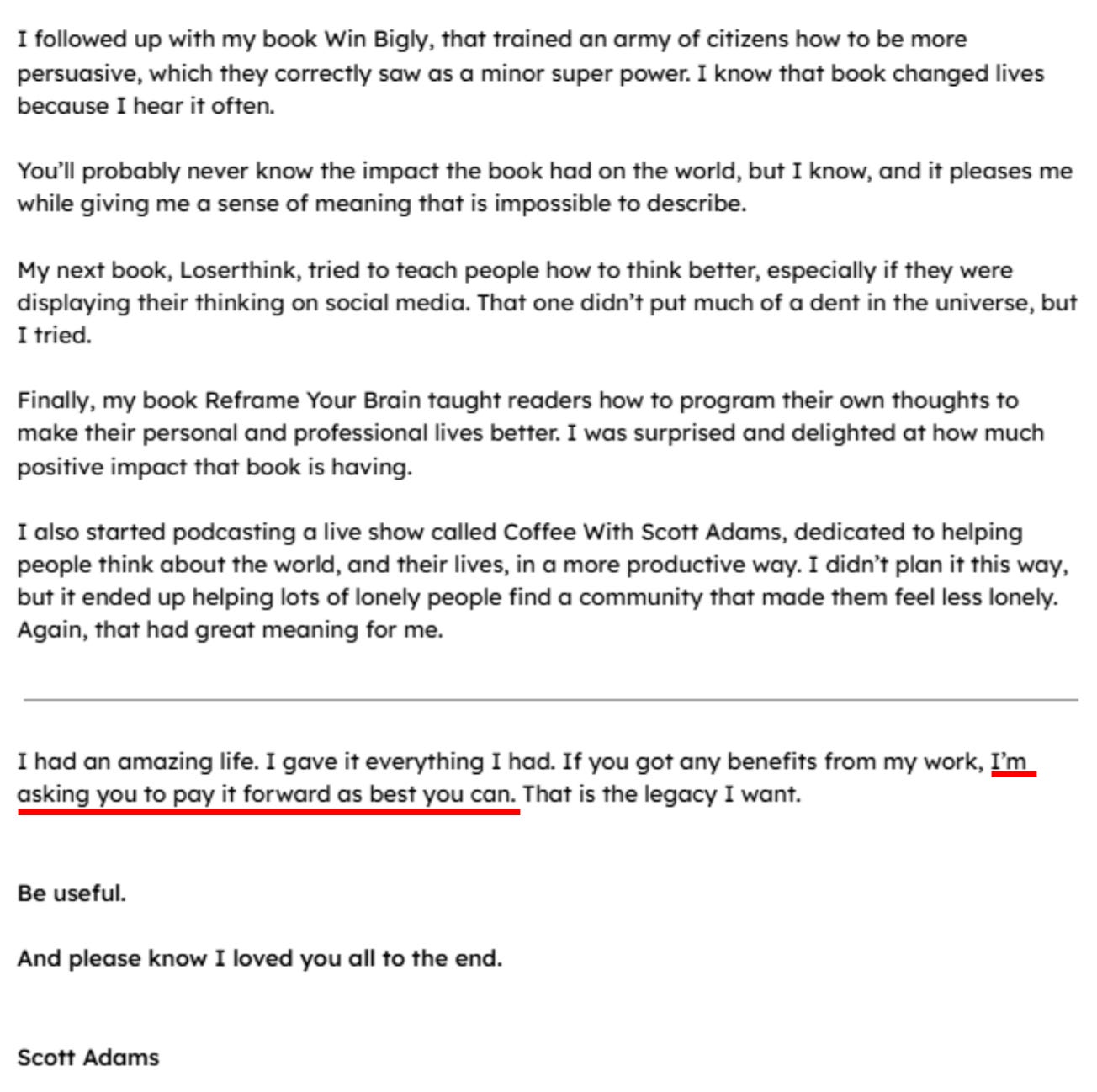 First, when Scott realized his condition was terminal, he decided that he wanted to spend his remaining time engaging with his followers through his political podcast as much as possible, even when he was on the verge of death. Had I been in Scott’s position, unless I felt I had critical things I needed to tie up and conclude with this newsletter, the last thing I would be doing with my last days would be being online.