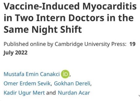 -Although heart attacks are the most likely to show up in young athletes (as they push their hearts the hardest), there was also an interesting case study I came across. It makes a compelling case something similar happens at a rate far exceeding what can occur by chance to another group of completely vaccinated young adults who I believe also undergo significant cardiac stress (during internship call shifts you have dangerous levels of sleep which are highly detrimental to cardiovascular health):
