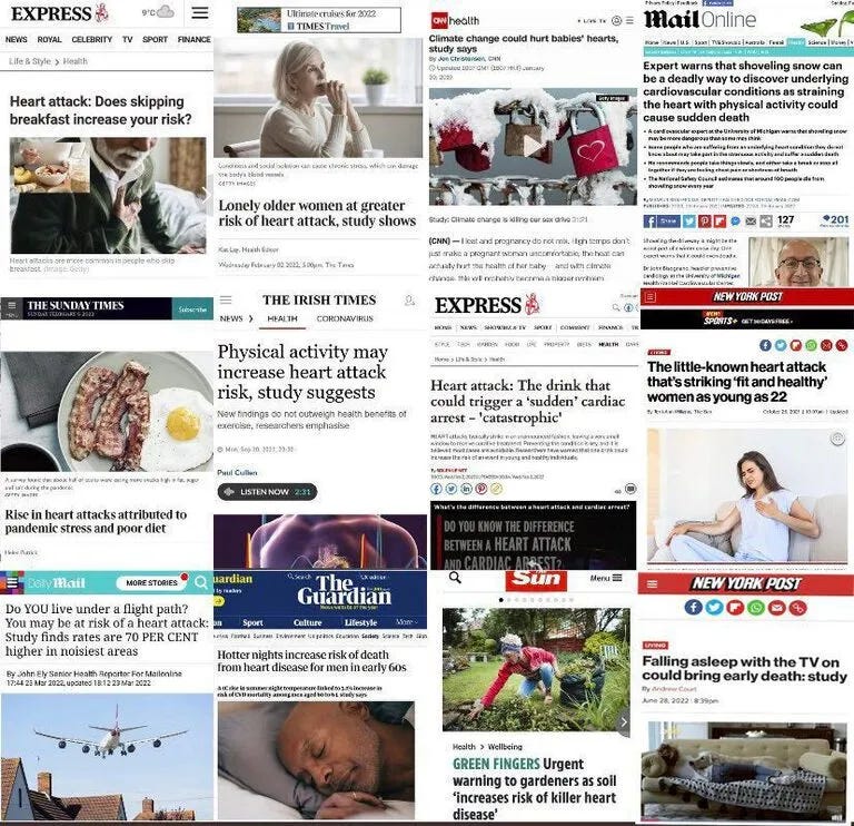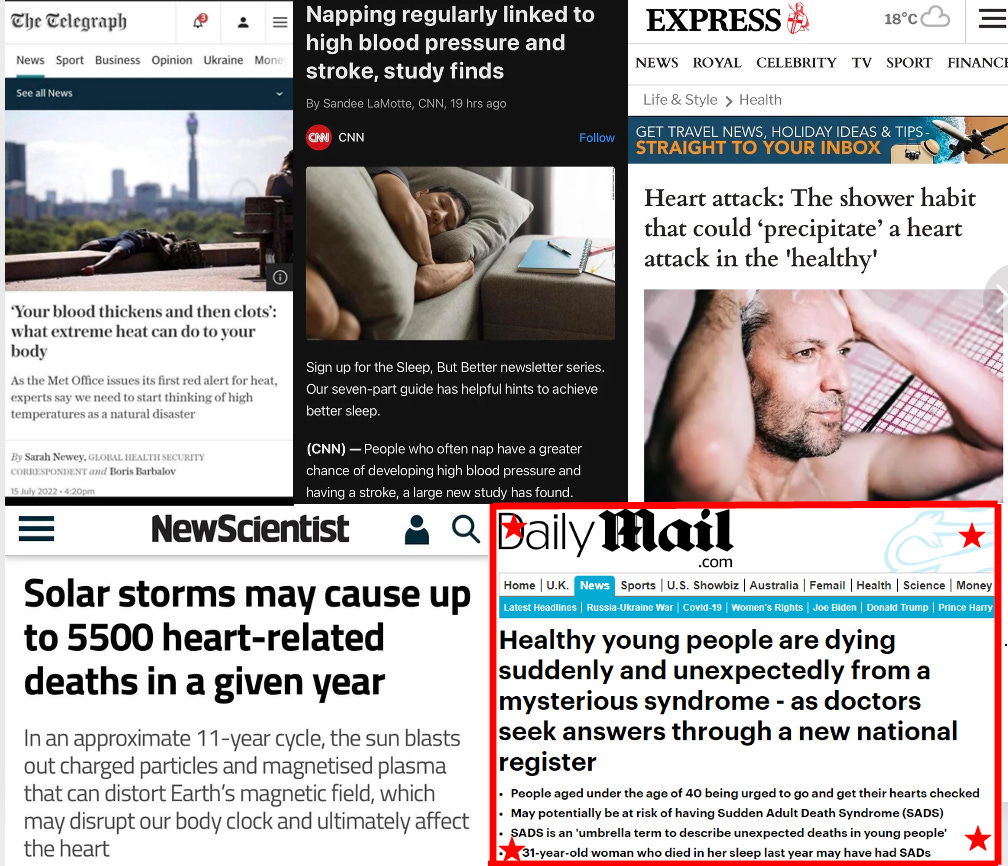 As we review these headlines, I must note that periods of sustained stress or economic hardship have a very strong association with heart disease (arguably it is one of the biggest contributors, Dr. Malcom Kenrick provides an excellent summary in this series) and for that reason, I do believe some of the heart attacks we are seeing arose as a direct result of the completely inappropriate lockdowns. However, while there may be some validity to that explanation, most of the other ones are absurd.