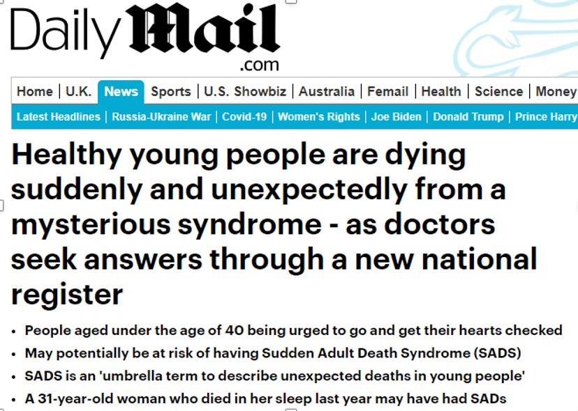 Since SADS started, there have been a flood of individuals in the news who “died suddenly” without any explanation given and in many cases this immediately followed a COVID vaccination (evidenced either by their obituary or social media postings). Occasionally, this has happened to the child of leader who has been fanatical in pushing the vaccine mandates (a few noteworthy cases were summarized by Steve Kirsch here).