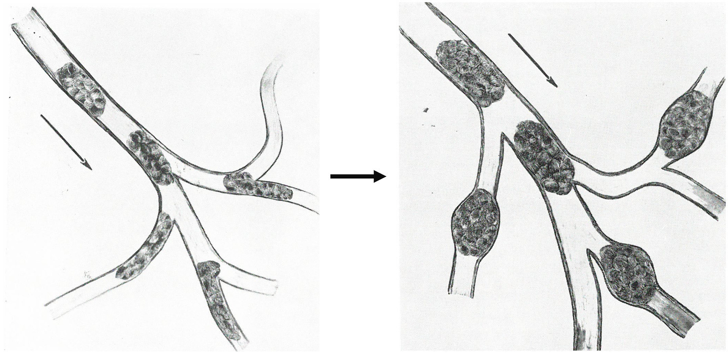 •Directly stretch the smaller blood vessels, thereby increasing their pressure (and simultaneously “stiffen” the arteries because the clumps of sludge would have significantly more resistance to compression than dispersed blood cells).