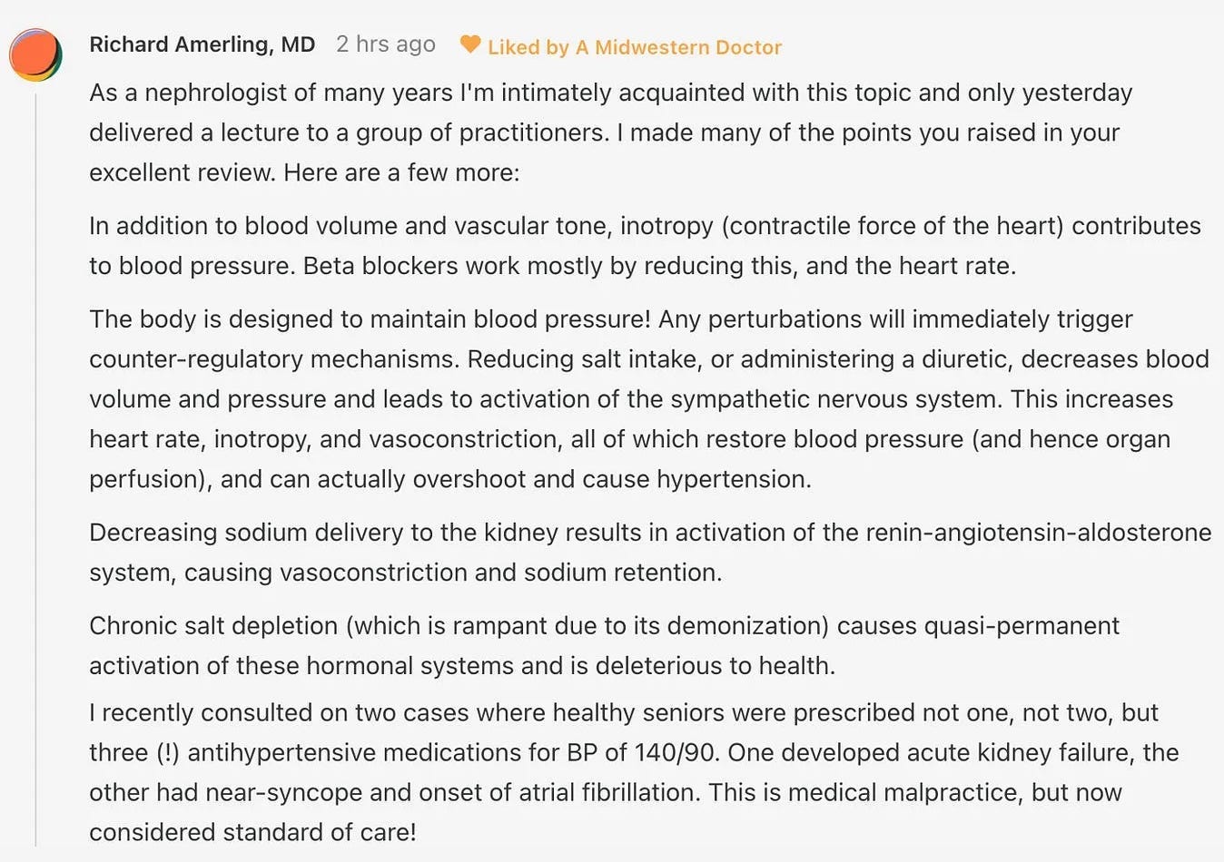 Most cases of high blood pressure (90-95% of them) are what is known as “essential hypertension” or “primary hypertension” which is a fancy (and rarely questioned) way of saying “elevated blood pressure without a known cause.” More importantly, the fact there is no known cause for most cases of elevated blood pressure has been a widespread belief in medicine for decades. Typically, the only cause we hear about is “eating salt,” despite the fact that the most detailed review of this subject found that drastic salt reduction typically results in less than a 1% reduction in blood pressure.