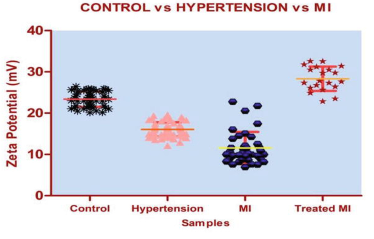 A 2019 study supports this. It compared the zeta potential of 64 patients with hypertension to 50 controls. It found the controls had an average zeta potential of -23.39 mV, while hypertensive patients had a zeta potential of -16.06 mV, and that heart attack (MI) patients had even worse zeta potentials.