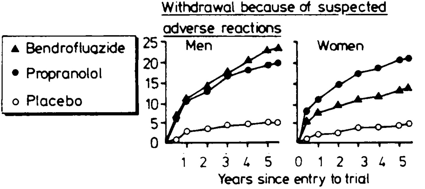 In 1973, a large UK study involving 17,354 patients with moderately high blood pressure (averaging 158/98 in men and 166/99 in women) compared beta blockers, diuretics, and placebos was conducted to prove lowering blood pressure stopped heart attacks. It found no significant difference in coronary event rates or death rates between groups. The only notable benefit was a slight reduction in (likely hemorrhagic) strokes, but side effects were common, causing 25% of participants to drop out.
