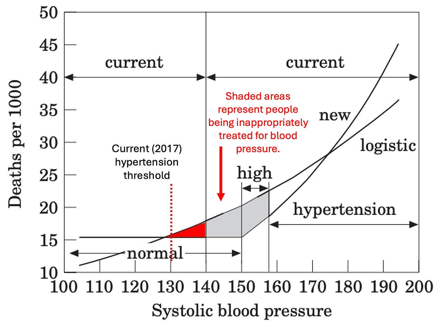 Flawed data: A re-analysis of the Framingham data in 2000 showed that blood pressure’s impact on mortality isn't linear. Instead, the risk only rises exponentially after a threshold is passed, typically when blood pressure exceeds 70-80% of what’s normal for age and gender.