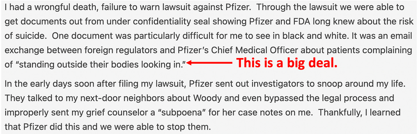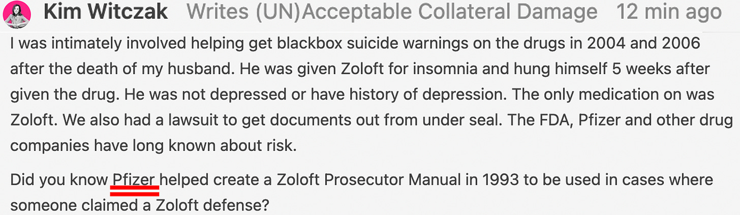 Note: Pfizer’s manual that was used to criminally convict victims of its SSRI (so the market could be shielded from public scrutiny) can be viewed here. Having reviewed it, I can state with certainty Pfizer included statements known to Pfizer to be false at the time this was written. If you have time after you finish reading this article, I would highly recommend reading Pfizer’s prosecutor manual so you can see just what vintage early 1990s gaslighting looked like (it is quite a bit more sophisticated now).