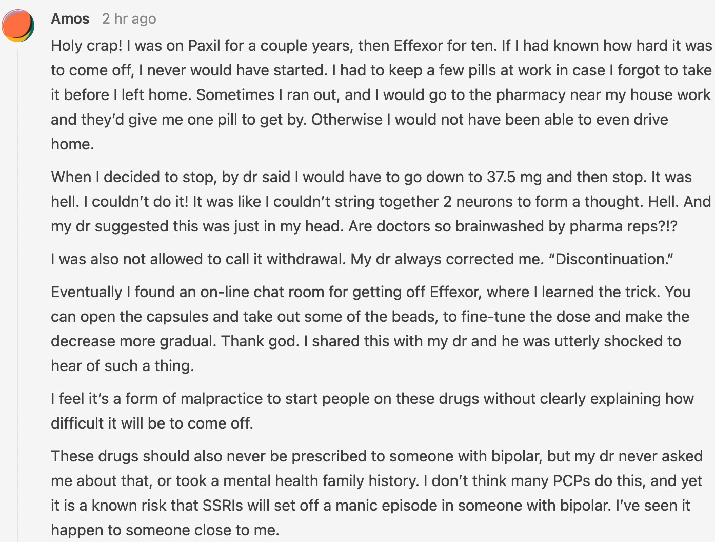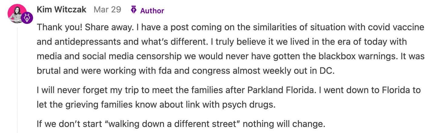 Having watched this dynamic play out for decades, it’s hard for me to put into words how monumental of a change this newfound awareness of the dangers of SSRIs is. The only comparable example I can think of are many people now being open to considering the dangers of childhood vaccination—something which has taken a century to bring into the public awareness (e.g., my friends who gave everything they had to speak out in the 1980s and 1990s on vaccine safety were almost completely alone and cannot believe just how much the public’s receptivity to this message has changed in the last few years).