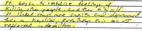 [Pt. began to verbalize feelings of killing other people and then himself. Pt. looked much more anxious and depressed than baseline; even though this is not reflected in Hamliton (the scale used to quantify anxiety in research)]
