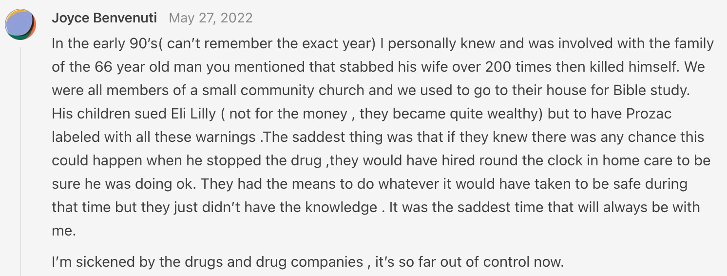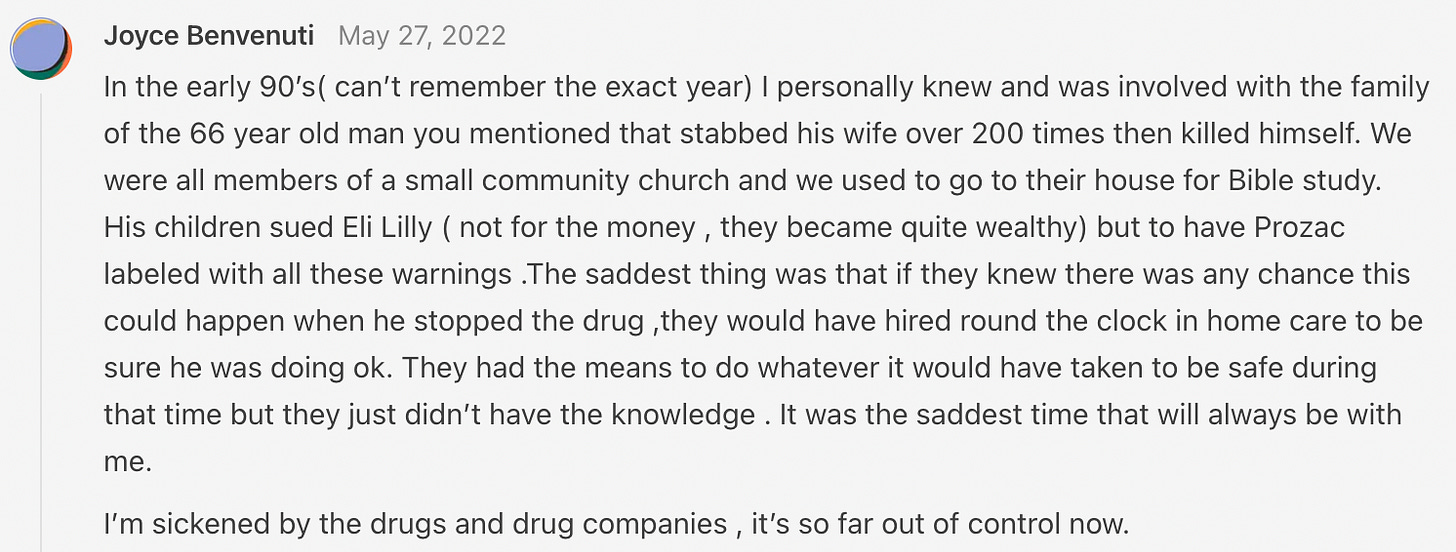 Fortunately, those attacks did not work, and the violent risks of SSRI’s have gradually become more acceptable to talk about (e.g., RFK Jr. has mentioned them during his presidential campaign and not backed down when challenged on the point).