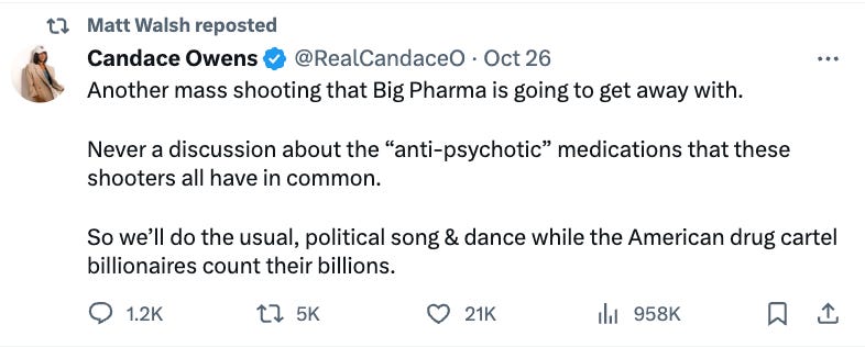 Note: since Audrey Hale’s shooting, additional mass shootings have also occurred (e.g., those mentioned by Walsh like the recent one in Maine) where it was known the individual had psychiatric issues, despite repeated warnings those issues were not addressed, and based their history was almost certainly on psyche meds (but the public has not been permitted to know if they were).