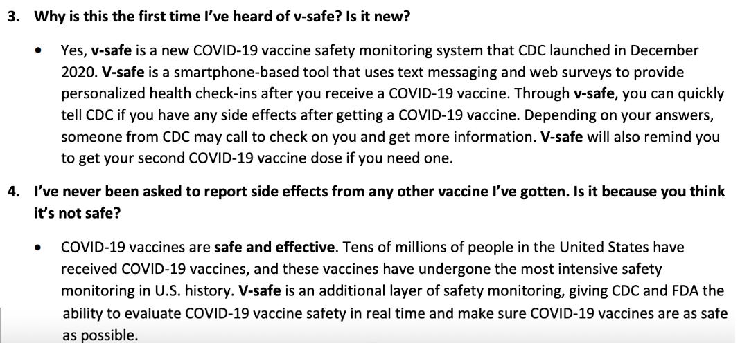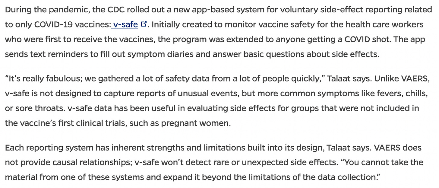 V-Safe briefly was a phone app aggressively marketed to the initial recipients of the vaccine (e.g. healthcare workers who could be expected to be reliable reporters of adverse events) were given and instructed to use to communicate to report their experiences. This approach is very important because this data was prospective (this data is always more reliable than retrospective data and considered necessary to demonstrate causality) and because the total number of participants was known (which is necessary to demonstrate the rate at which adverse events occurred). The CDC was also supposed to follow up with individuals who reported adverse events, although I am somewhat doubtful this occurred (e.g. one reader here who was hospitalized by a blood clot’s follow-up consisted of being instructed to report the event to VAERS).