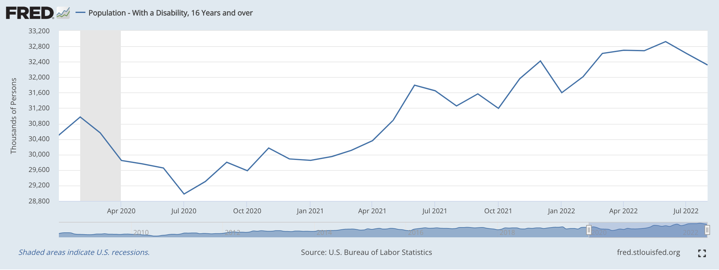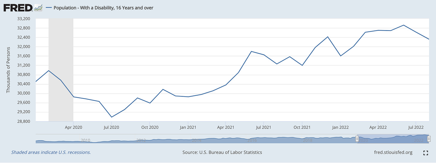 Recently, I discussed evidence that vaccinations were causing a massive spike in disability (which is sadly one of the very common results of medical injuries). With that dataset, I suspected that there would continue to be an upward trend in the disabilities from the time that they were first identified to now (as many of the effects from vaccination are chronic and worsen over time), but the rate of increase would level off as a result of individuals declining further vaccination (which fortunately has happened, in a state without mandates, only 1 in 573 people has accepted the most recent booster).