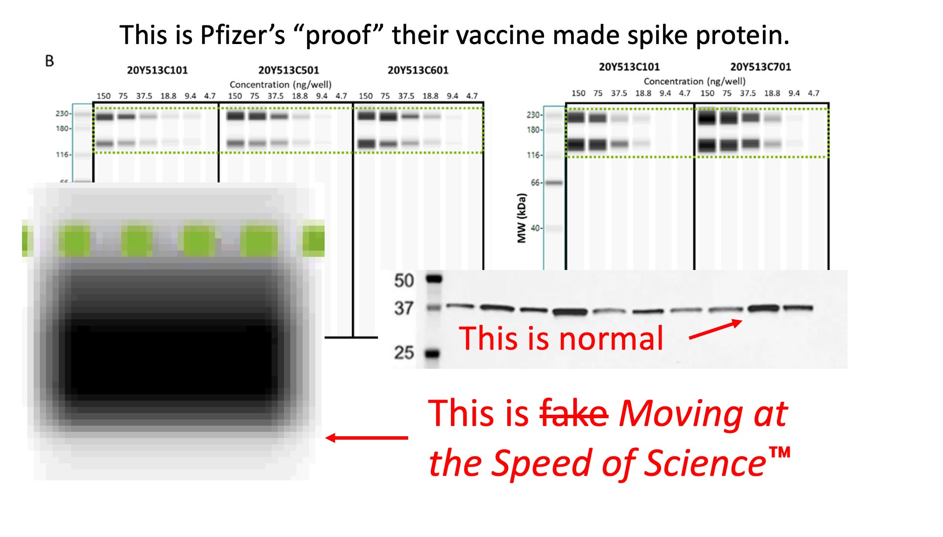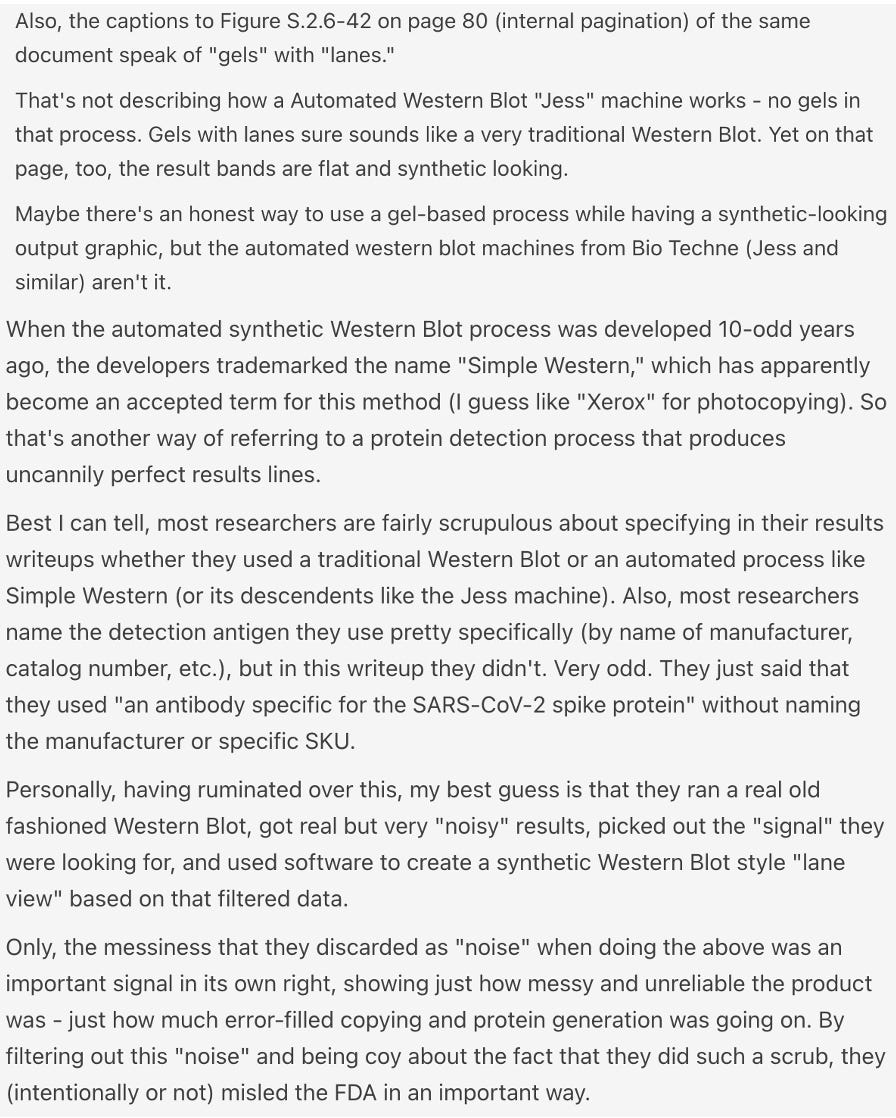 We spent the last week asking everyone we could about this. To our knowledge, the only possible way blots this straight could form was if they were made on a computer. The fact that no one at the FDA spotted this either means that they did not read Pfizer’s submission (which is likely as they had an almost impossible amount to go through in a very short time and signed off without looking at it) or that they were simply not willing to challenge any aspect of Pfizer’s approval process and the submission was a formality to present the veneer of it being scientific.