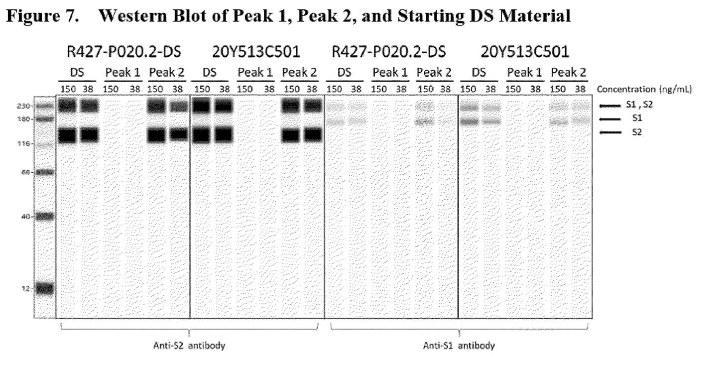 For some additional context, the blot below was made by independent researchers evaluating the final protein products of Moderna (although not identical, both Pfizer and Moderna used the same amino acid sequence for their final spike protein). Note how much more irregular it is than Pfizer’s results. This difference from the perfect blots obtained for Pfizer by Pfizer’s researchers suggest the lack of irregularity (which is almost inevitable) observed in the final western blot was a result of Pfizer misrepresenting their results and providing the false impression they had no irregularities.