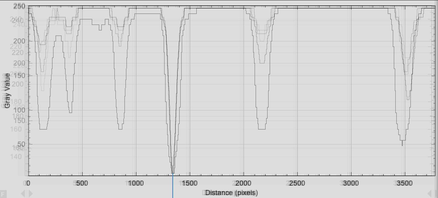 Although we were relatively certain by this point that this “blot” was a quick computer job, we went a step further and plotted their darkness against distance. This is what their profiles looked like when stacked together: