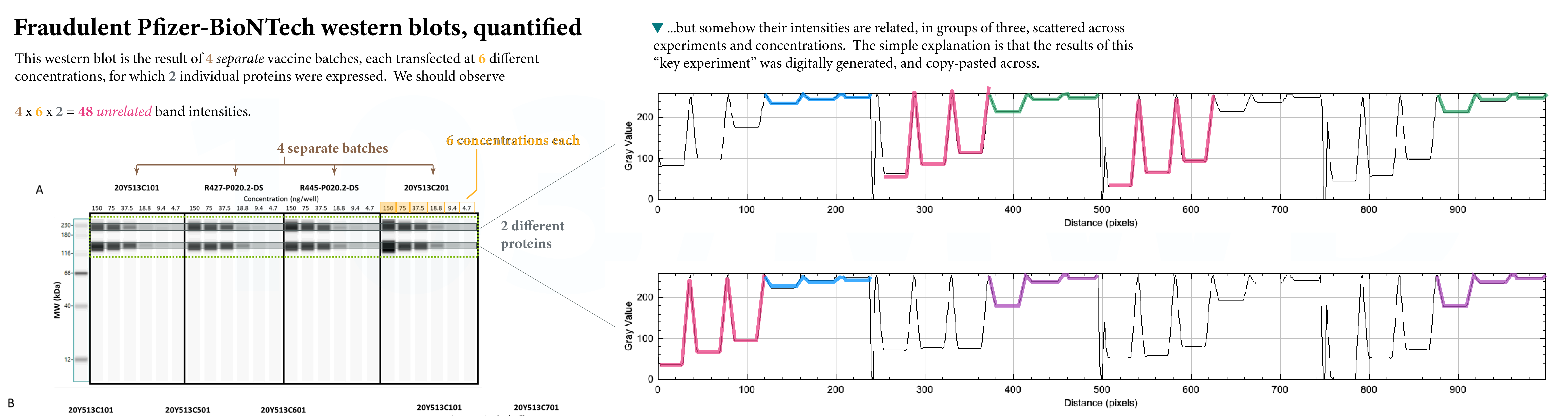 I think the points made here are pretty straightforward. Please let me know if you see any errors or mistakes in this analysis. If not, please share this as far as you can. The only competing hypothesis we have at this point from any of the people we have contacted is that these blots were made in software designed for simulating western blots to optimize lab conditions, but that would still not invalidate that they were fraudulent.