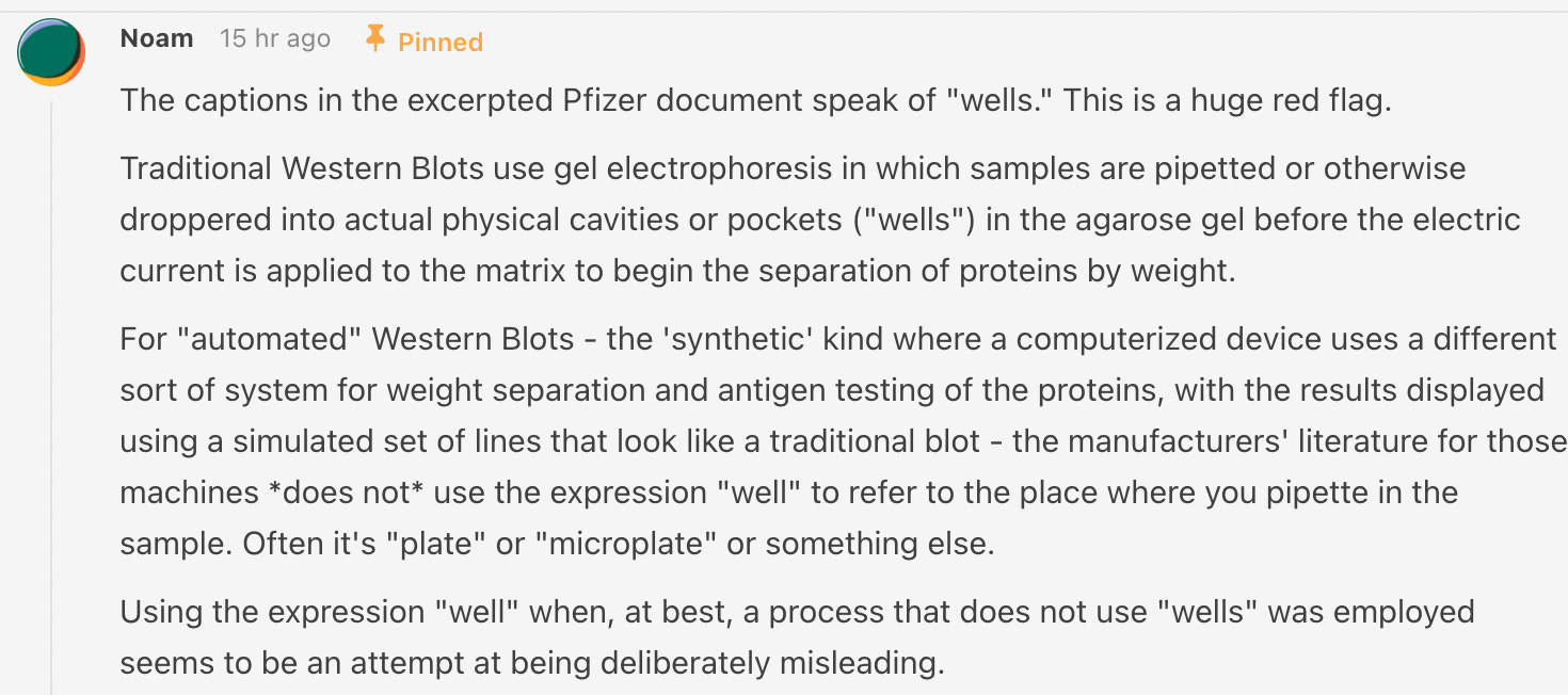 Fraud is a huge allegation to put forward, so since that time we did our best to vet the discovery and sent it out to independent parties who could validate it prior to publishing. Based on the feedback we have received since publishing this, there is a chance one of my key allegations is false (that the image being a digital straight line means it was not representative of the actual proteins present) as there was an additional approach to evaluating this we were not aware of at the time of publication. I still believe the central allegation (that the vaccines do not contain what was advertised) holds true and is critically important to understand. At this point in time we do not presently have the information to determine if the numerous suspicious characteristics we specifically identified in Pfizer’s western blots could be explained by anything besides fraud and eagerly invite any clarifications on this issue.