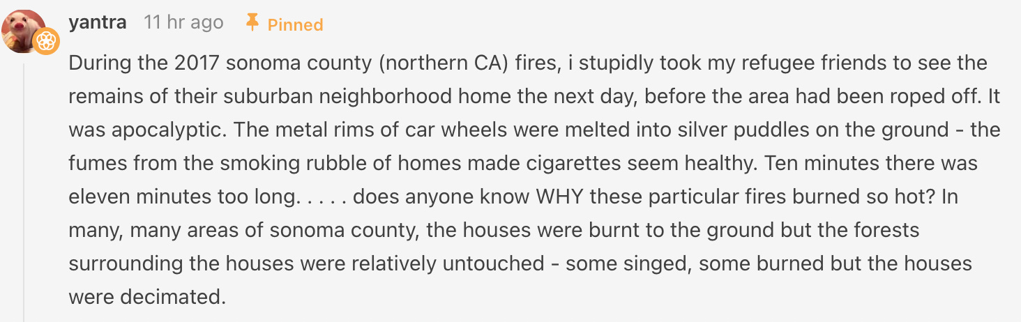 Note: my colleague also believed some of the fire's toxicity came from all the human structures (e.g., houses) that burned down and dispersed their contents into the atmosphere. I also suspect many of these buildings were old enough to have had various now-banned building materials like asbestos and lead paint (additionally, Kendrick has made a strong case lead being aerosolized from combusting leaded gasoline used to be one of the primary causes of heart disease in America due to how lead particles damage the endothelium).